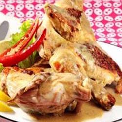 - Masukkan ayam panggang lalu masak terus sampai santan menyusut dan kering serta berminyak dan ayam matang. Angkat dan sajikan hangat.