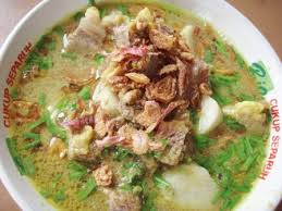 - Tuang air kaldu lalu garam dan gula pasir, aduk dan masak hingga mendidih. Tambahkan santan dan masak hingga matang. Angkat lalu sajikan dengan taburan cabai kering, kucai dan bawang merah goreng.